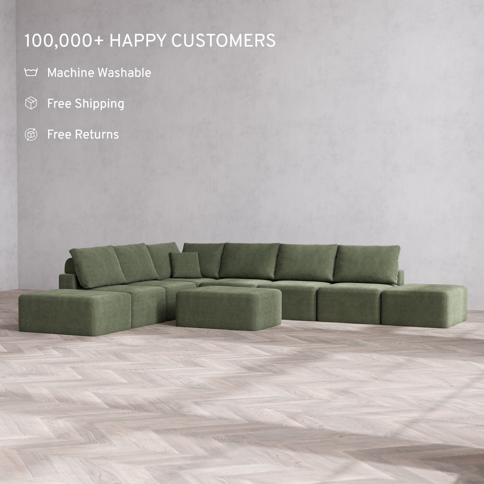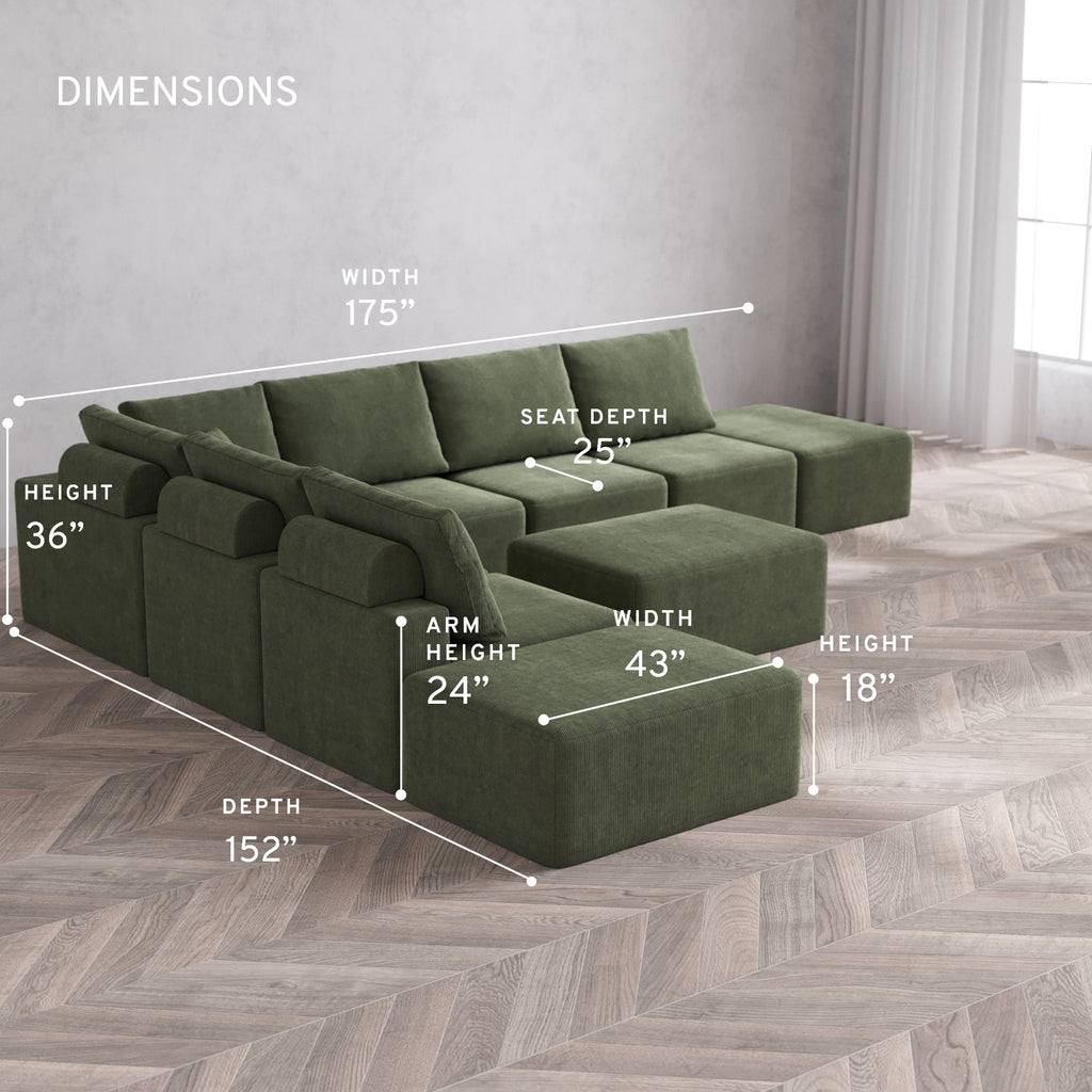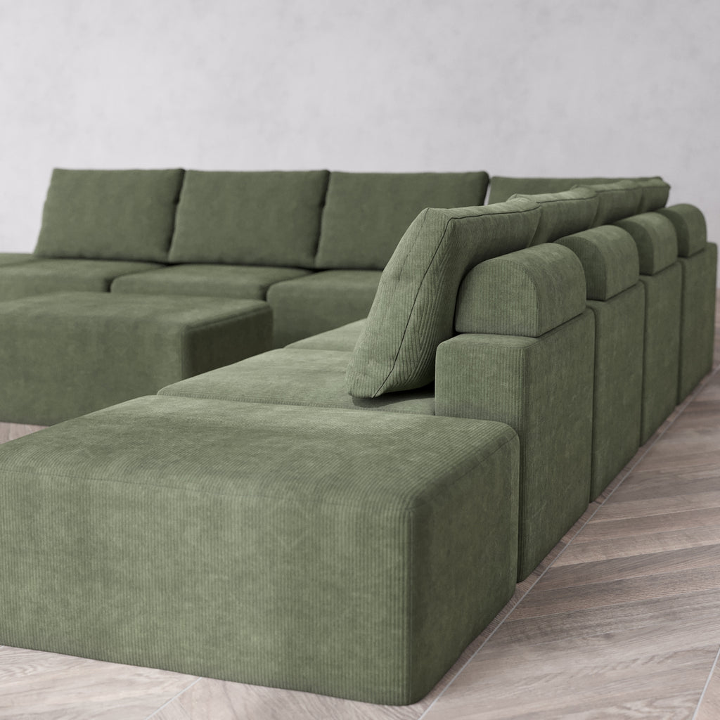 Modular Washable 8-Seater Open-Ends Corner Sectional + Chaise Ottoman Cloud + Bolster Sofa | Luxe Corduroy in Juniper