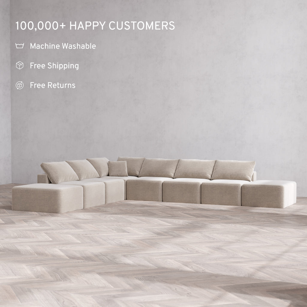 The Only Washable Cloud Sofa: With a waterproof frame and fabrics that resist pets, stains, and spills, this sofa is made to handle everyday messes. Our patent-pending covers are machine washable and fully interchangeable—buy extra sets to change up your look anytime.