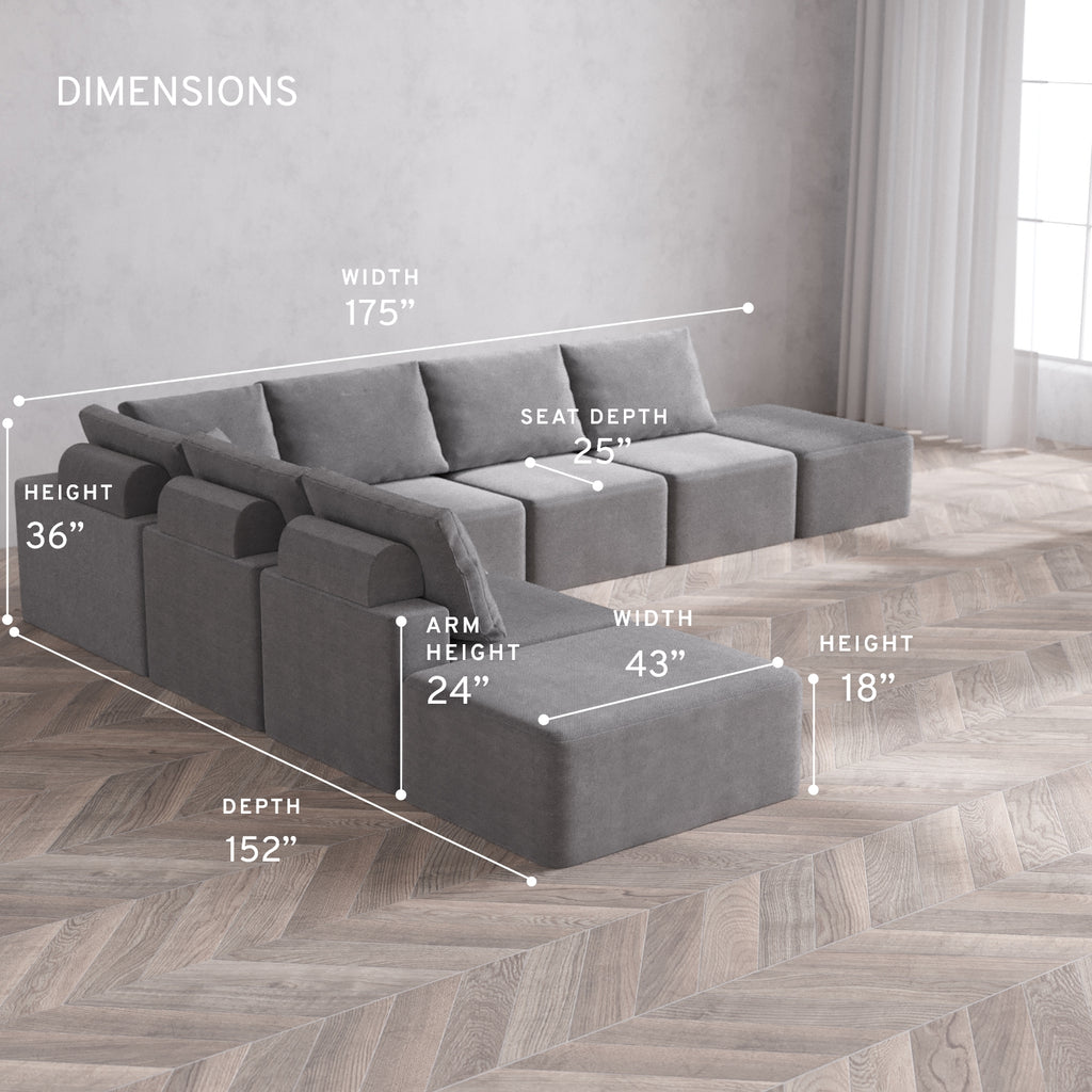 Modular Washable 8-Seater Open-Ends Corner Sectional Cloud + Bolster Sofa | Lux Weave in Slate