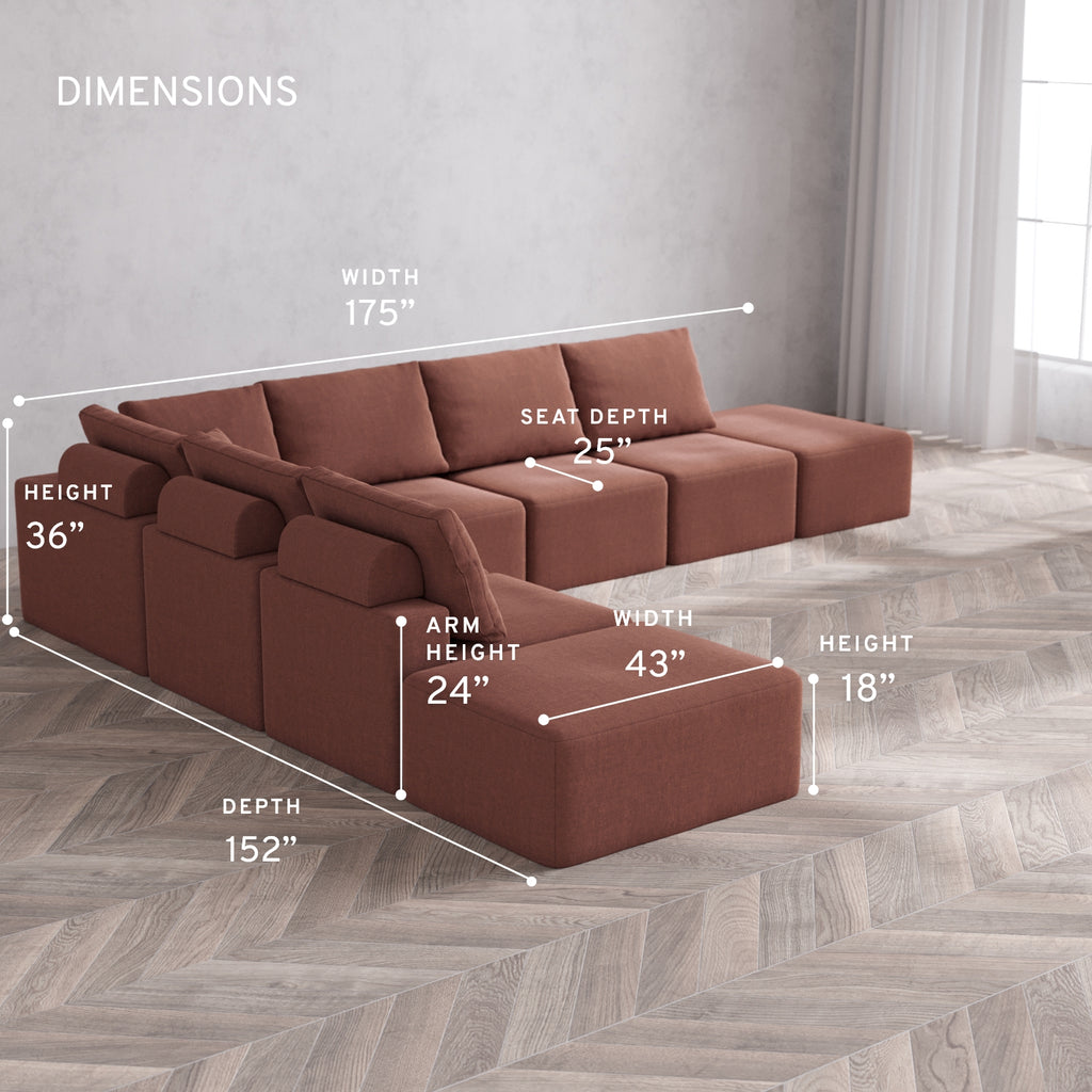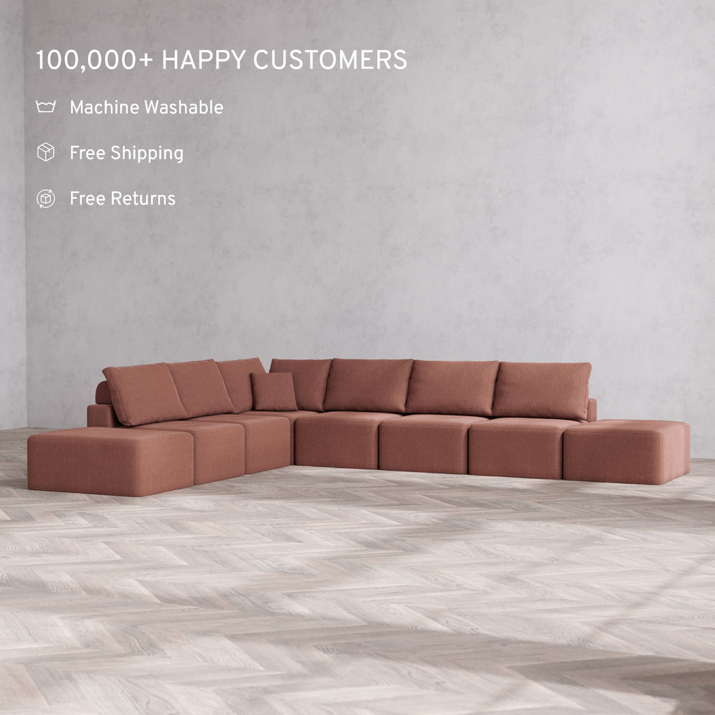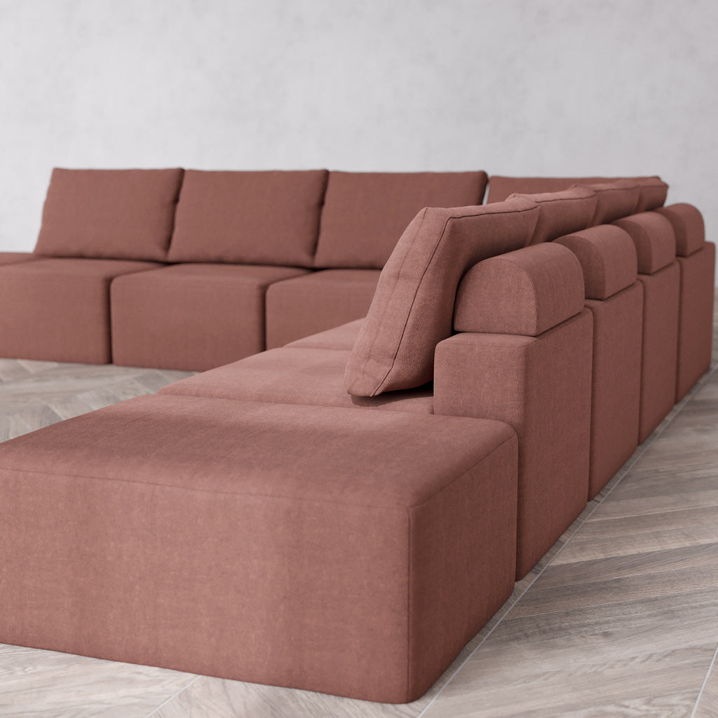Modular Washable 8-Seater Open-Ends Corner Sectional Cloud + Bolster Sofa | Heirloom Velvet in Sumac