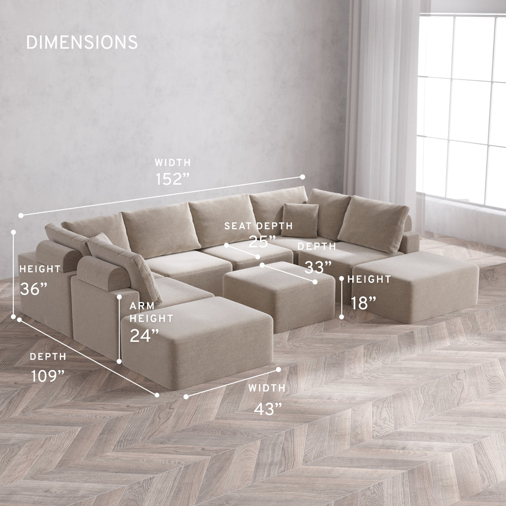 Modular Washable 8-Seater Open-Ends U Sectional + Ottoman Cloud + Bolster Sofa | Satin Velvet in Caraway
