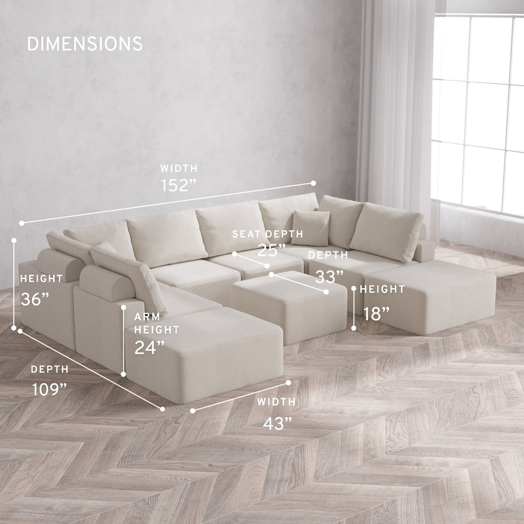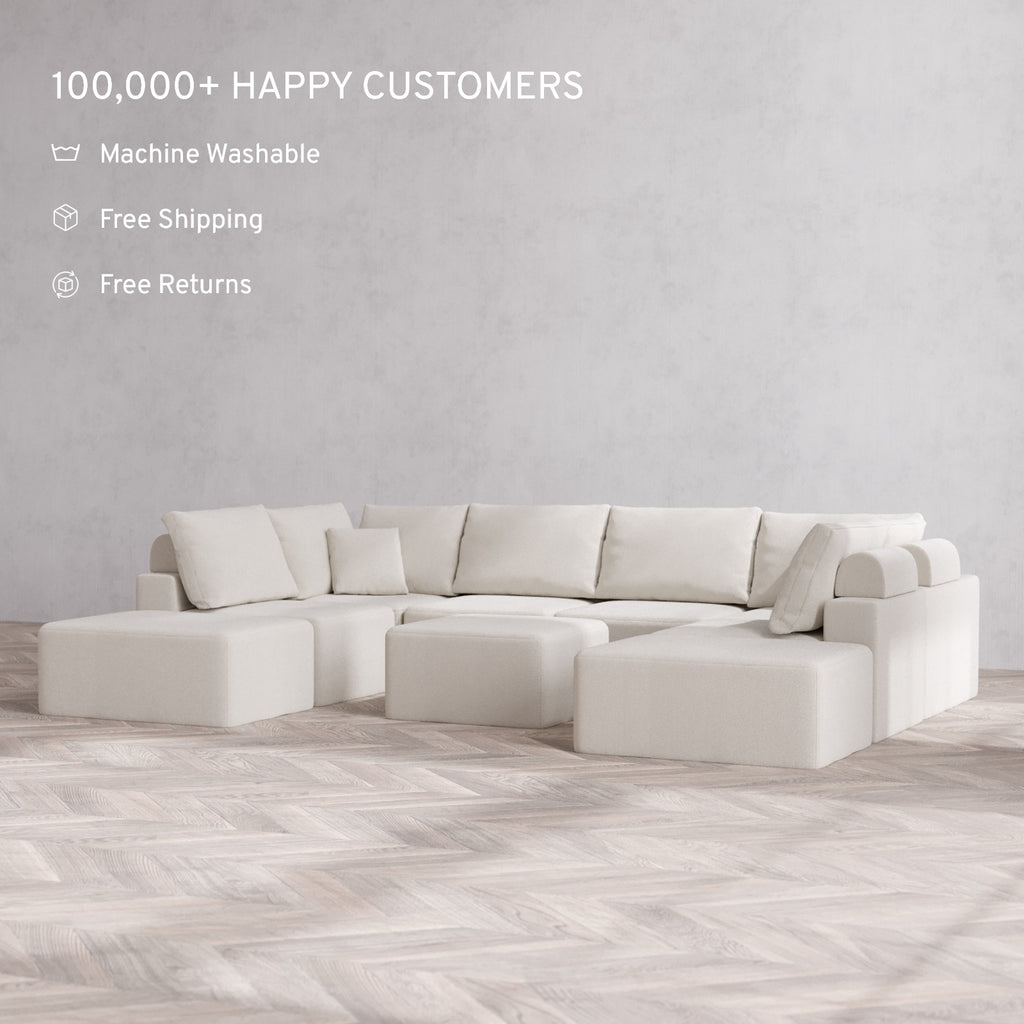 Modular Washable 8-Seater Open-Ends U Sectional + Ottoman Cloud + Bolster Sofa | Lux Weave in Pearl