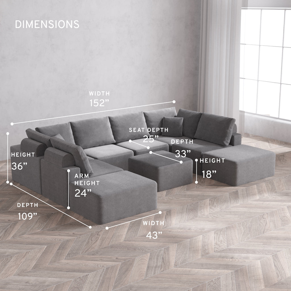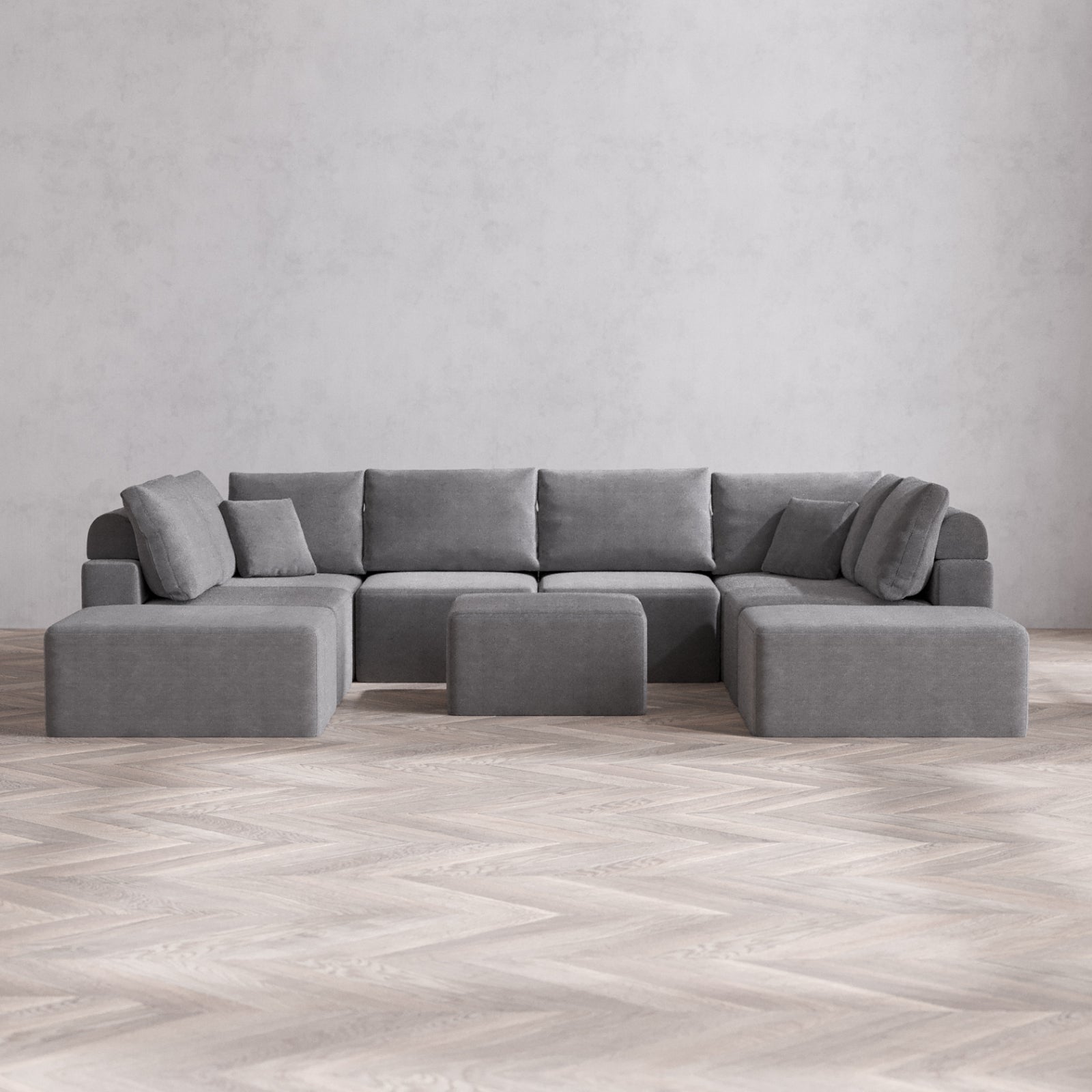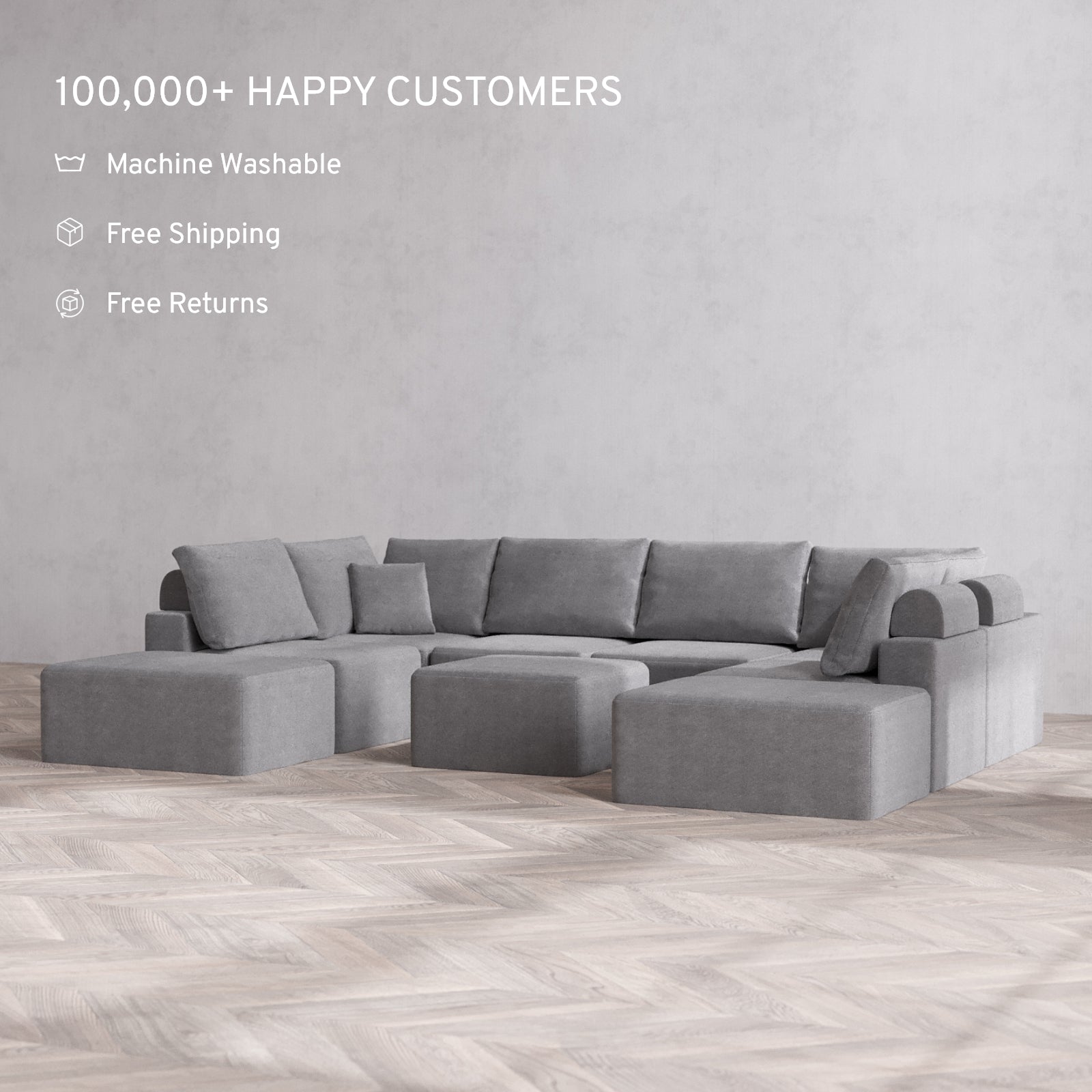 Modular Washable 8-Seater Open-Ends U Sectional + Ottoman Cloud + Bolster Sofa | Lux Weave in Slate