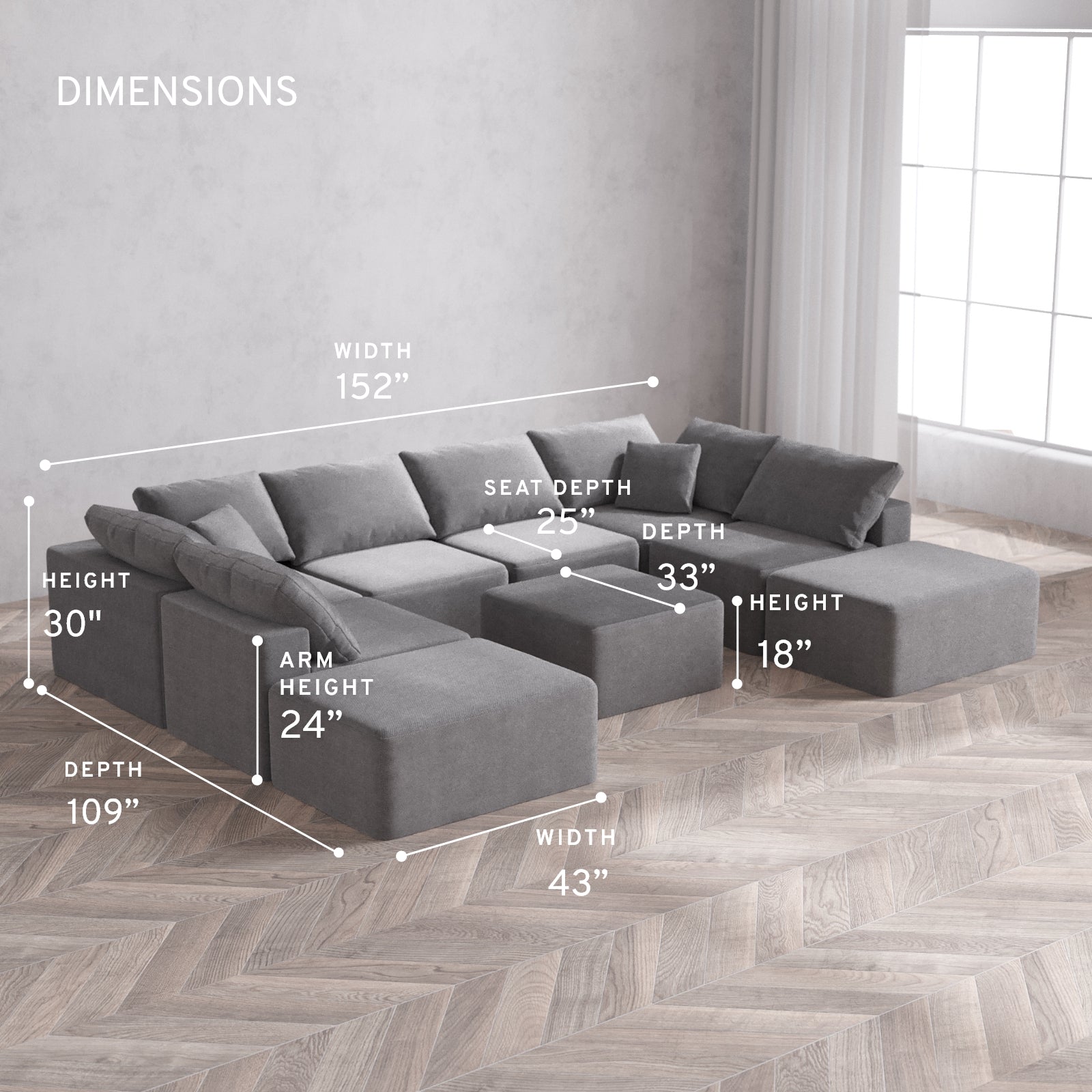 152” Wide, 109” Deep, 36” Tall