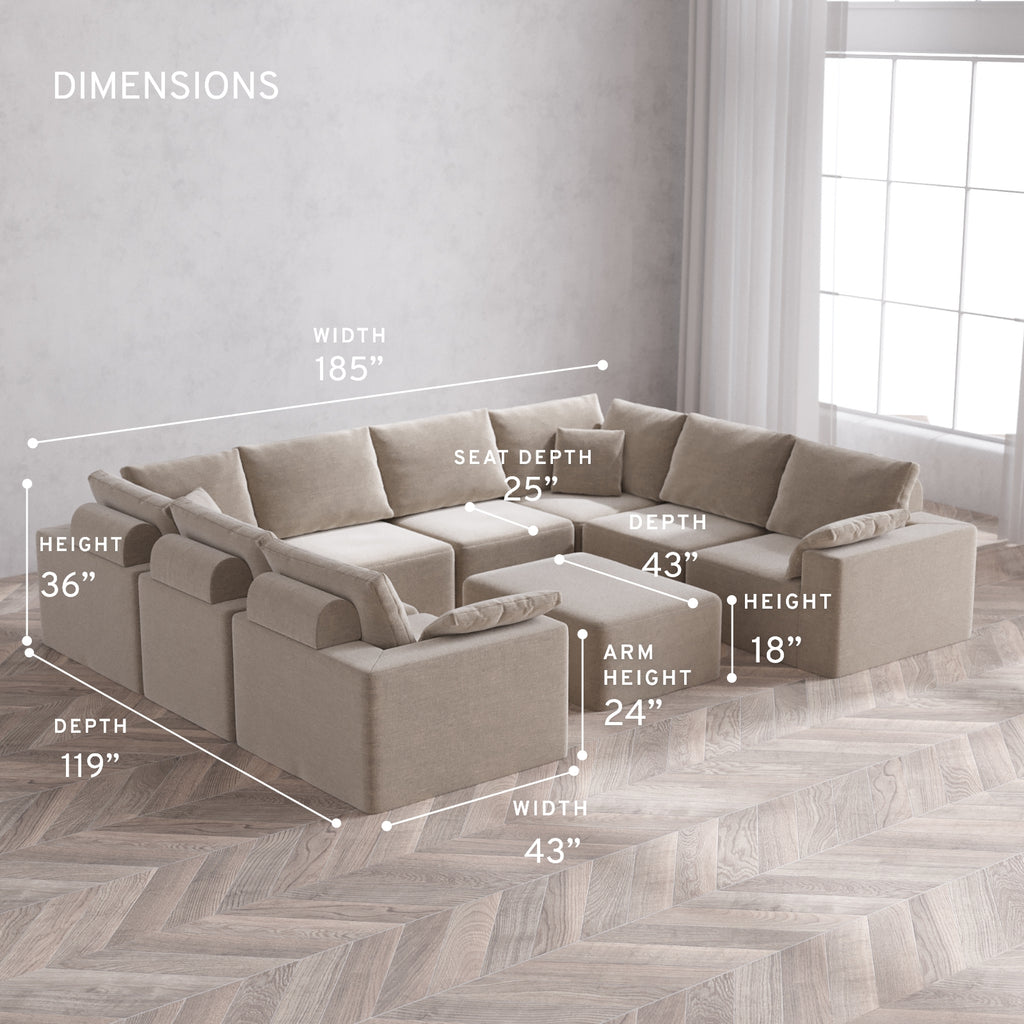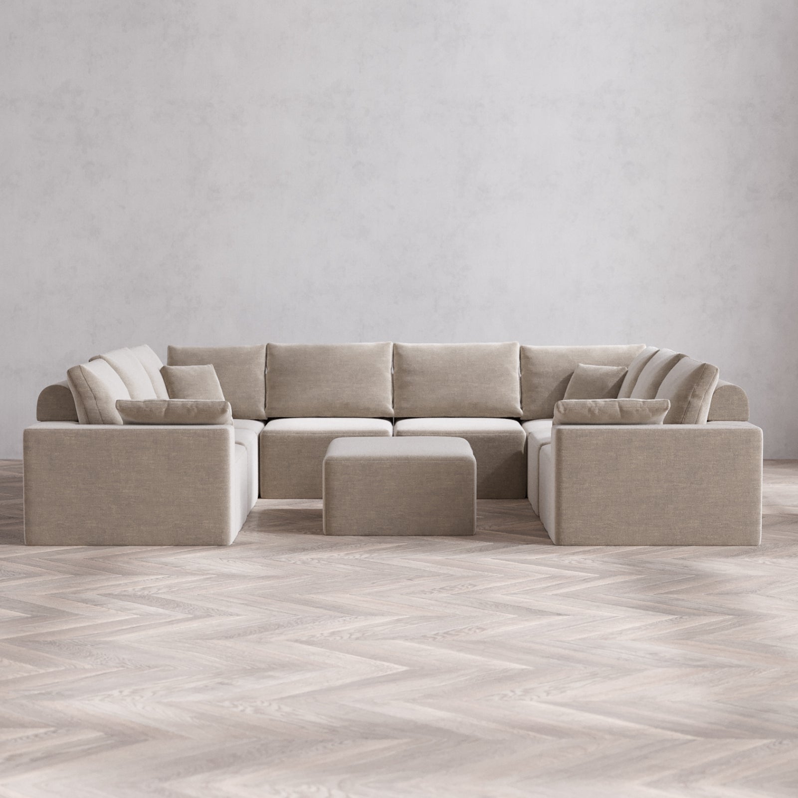 Modular Washable 8-Seater U Sectional + Chaise Ottoman Cloud + Bolster Sofa | Satin Velvet in Caraway