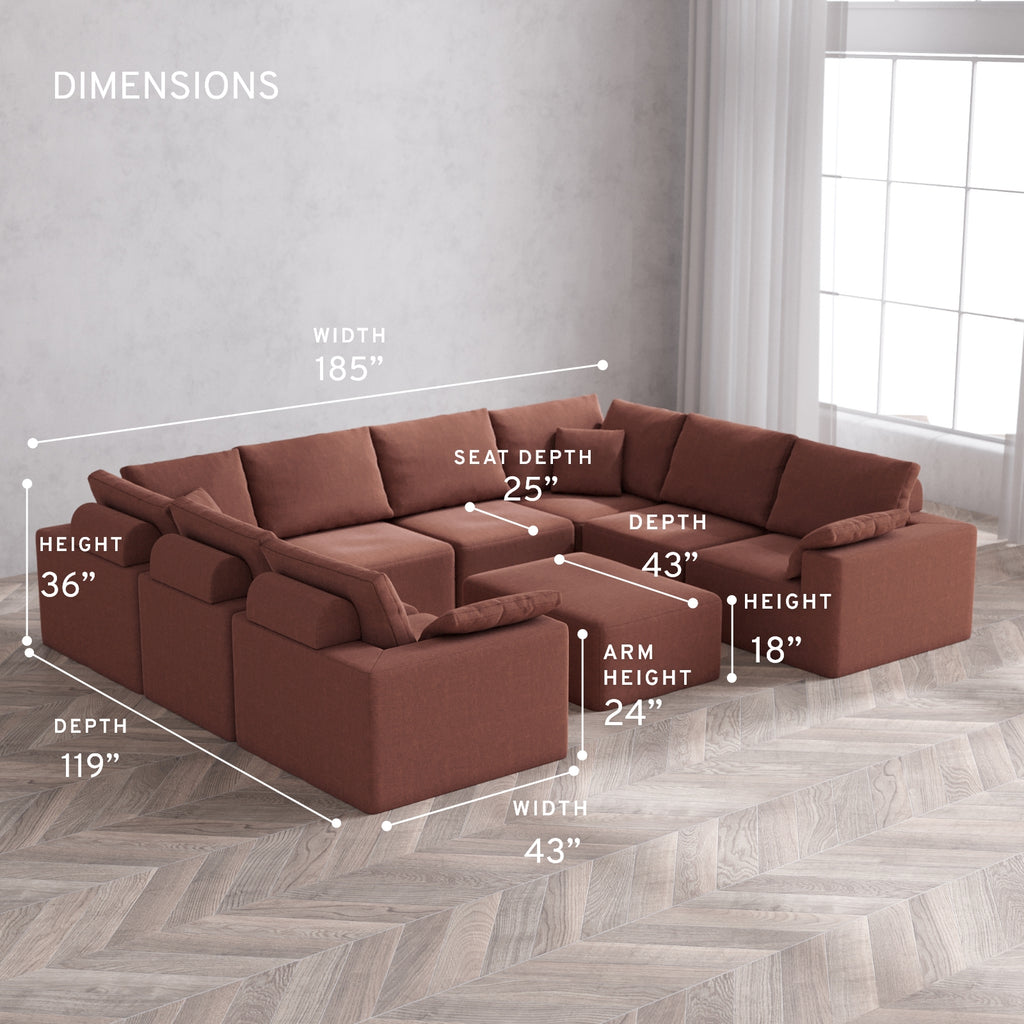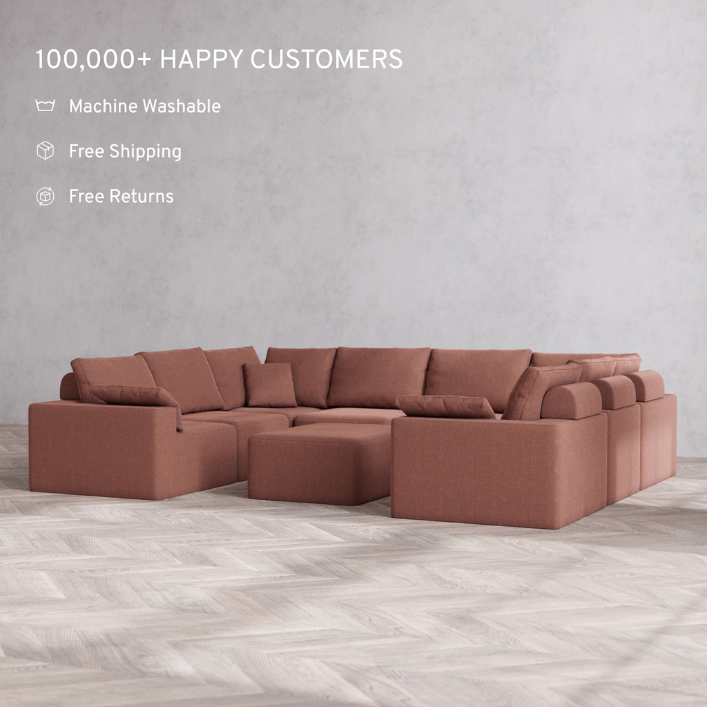 Modular Washable 8-Seater U Sectional + Chaise Ottoman Cloud + Bolster Sofa | Heirloom Velvet in Sumac
