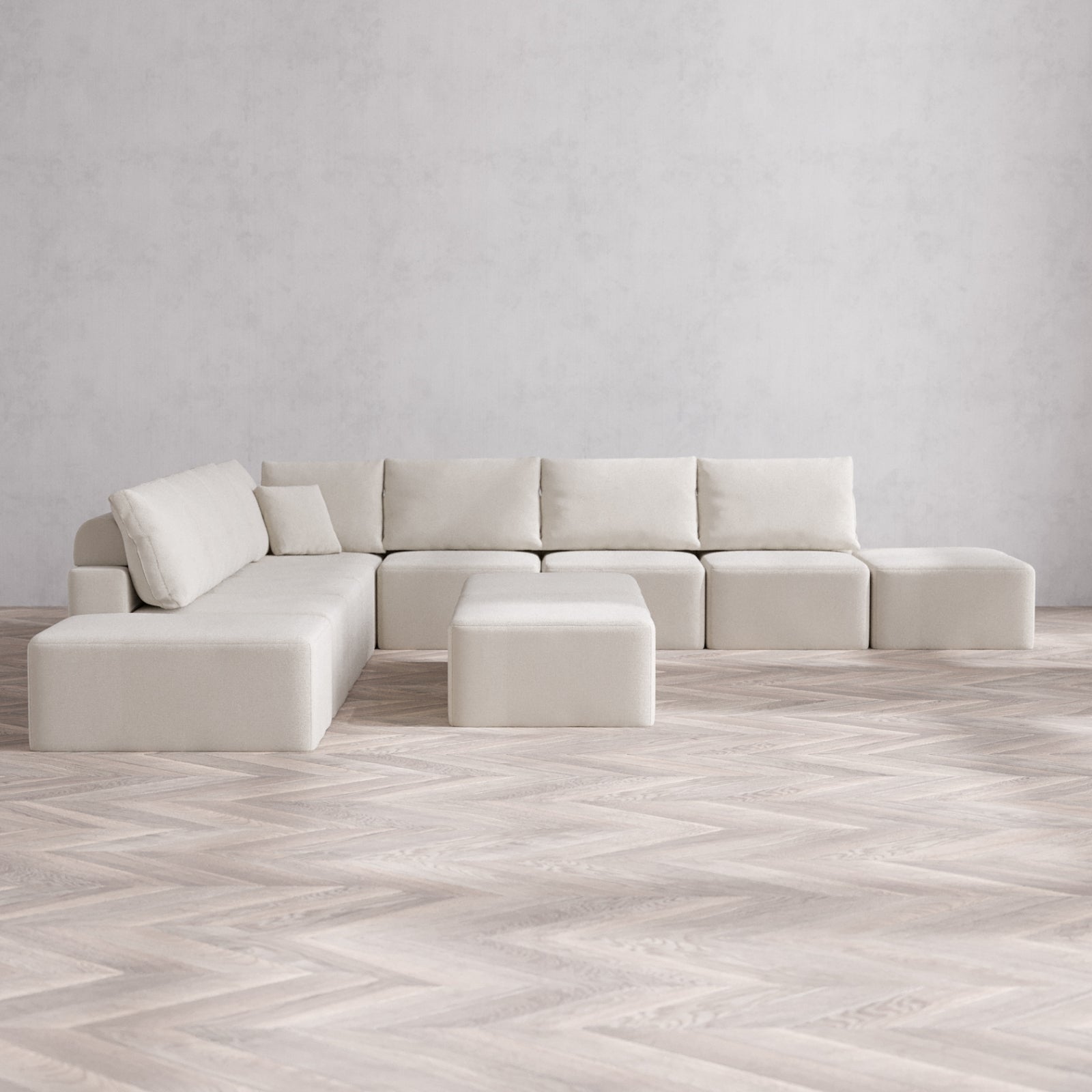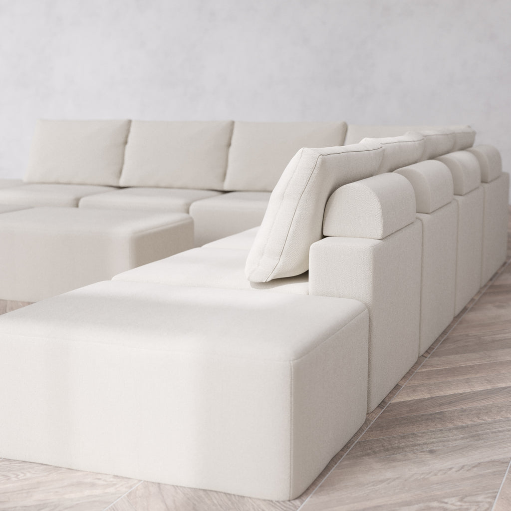 Modular Washable 9-Seater Open-Ends Corner Sectional + Chaise Ottoman Bench Cloud + Bolster Sofa | Lux Weave in Pearl