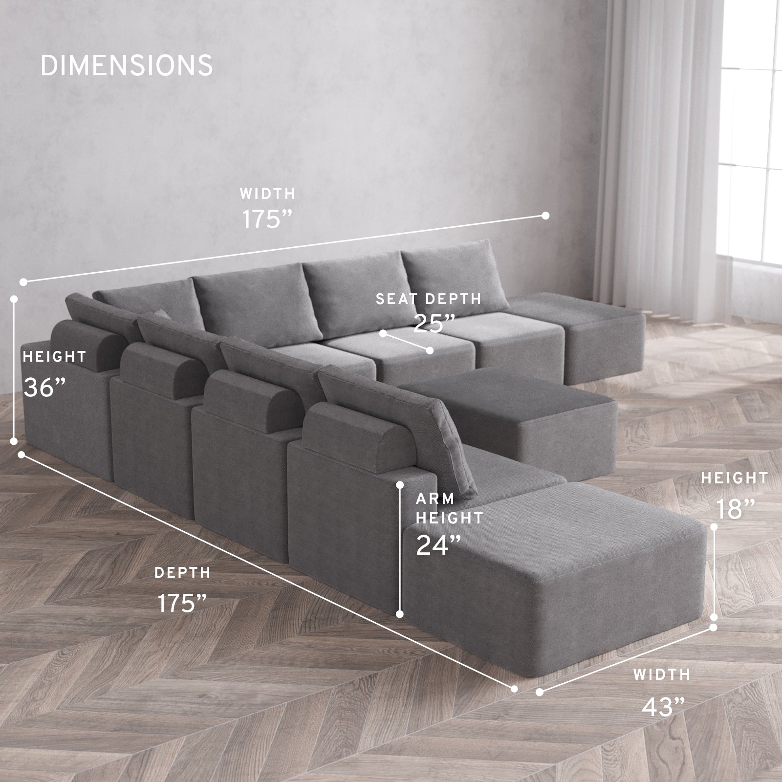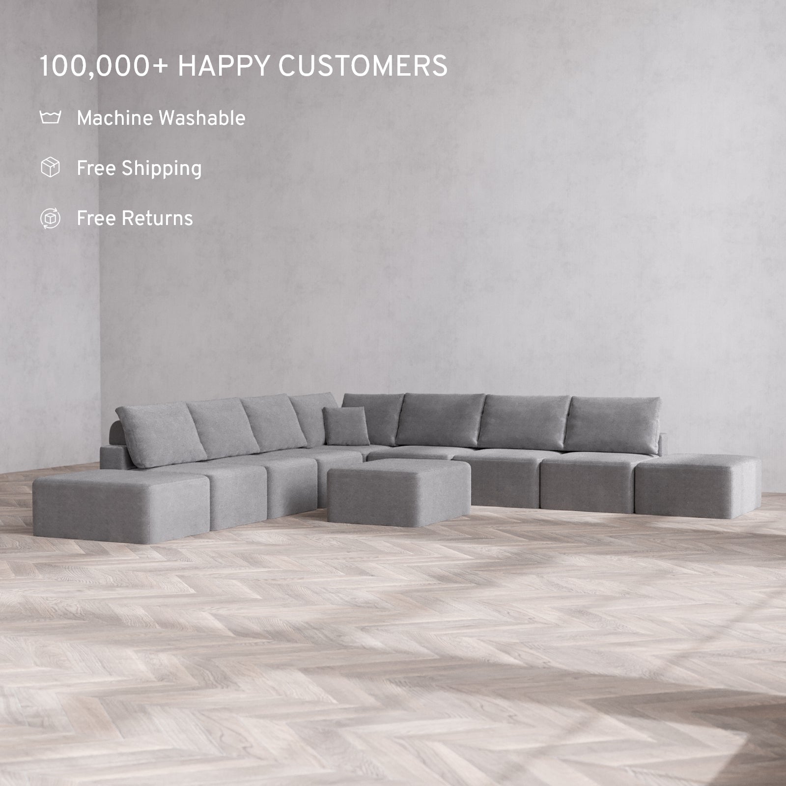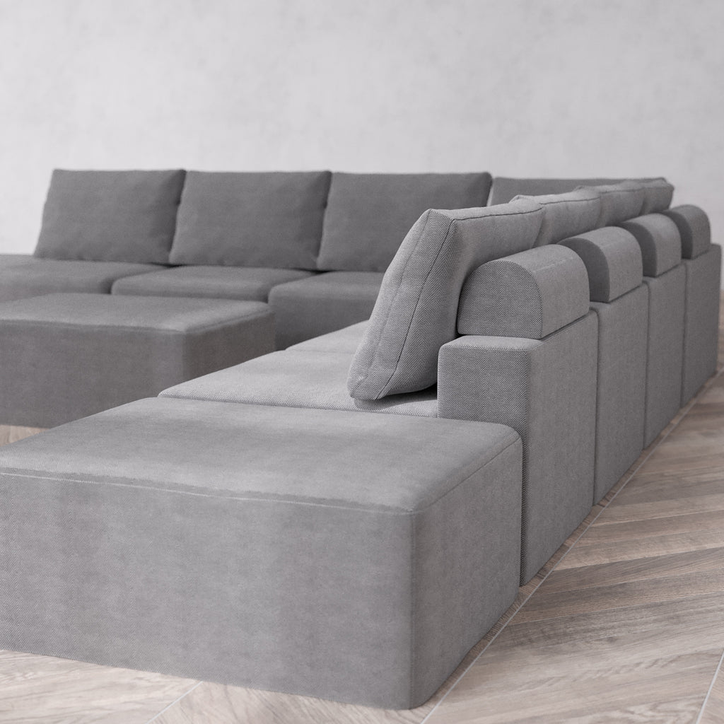 Modular Washable 9-Seater Open-Ends Corner Sectional + Chaise Ottoman Cloud + Bolster Sofa | Lux Weave in Slate