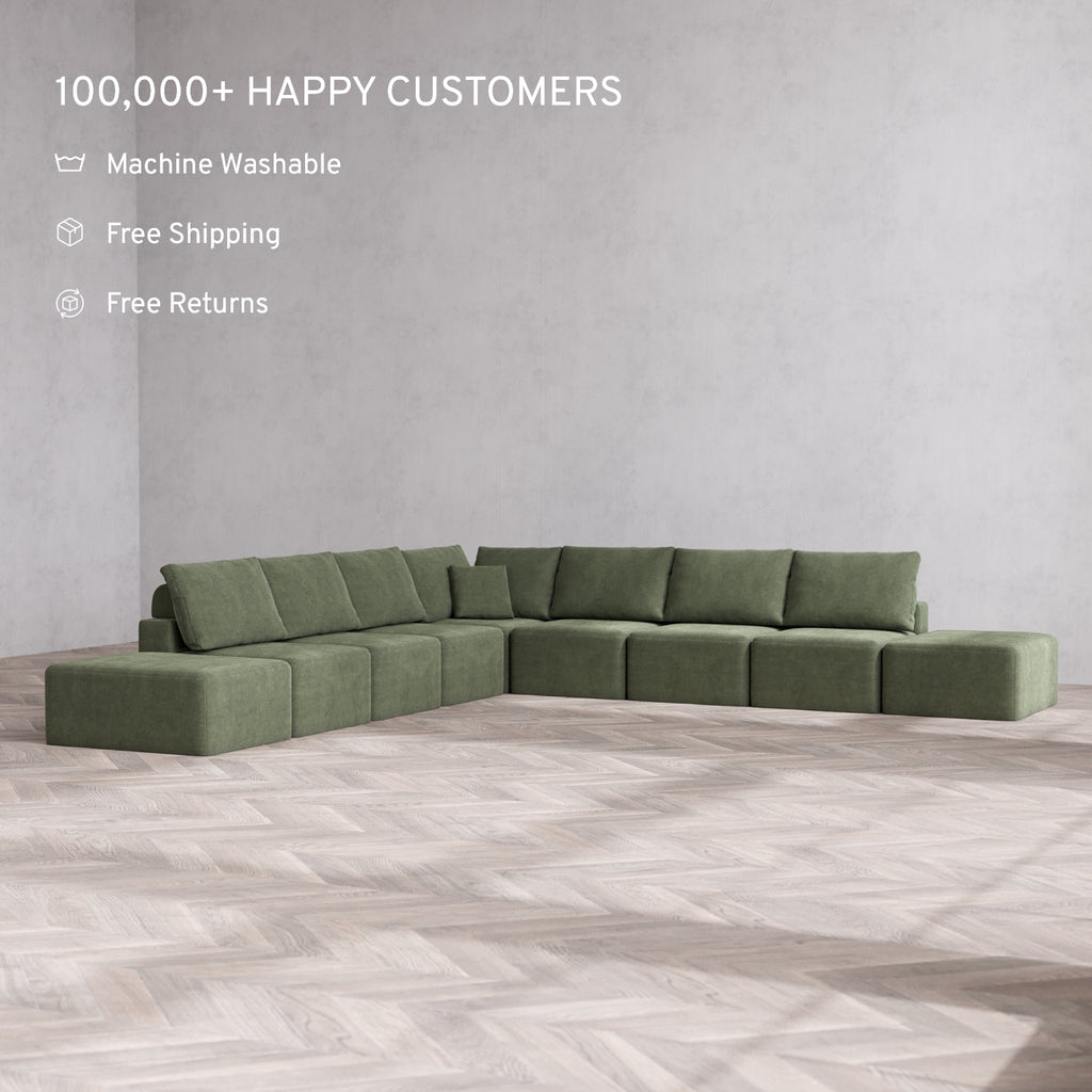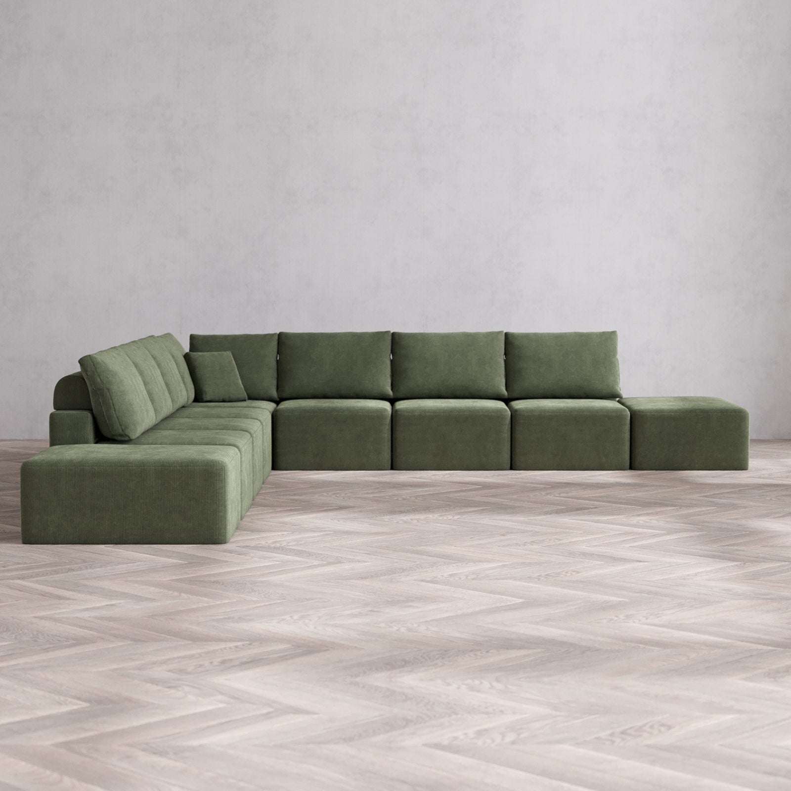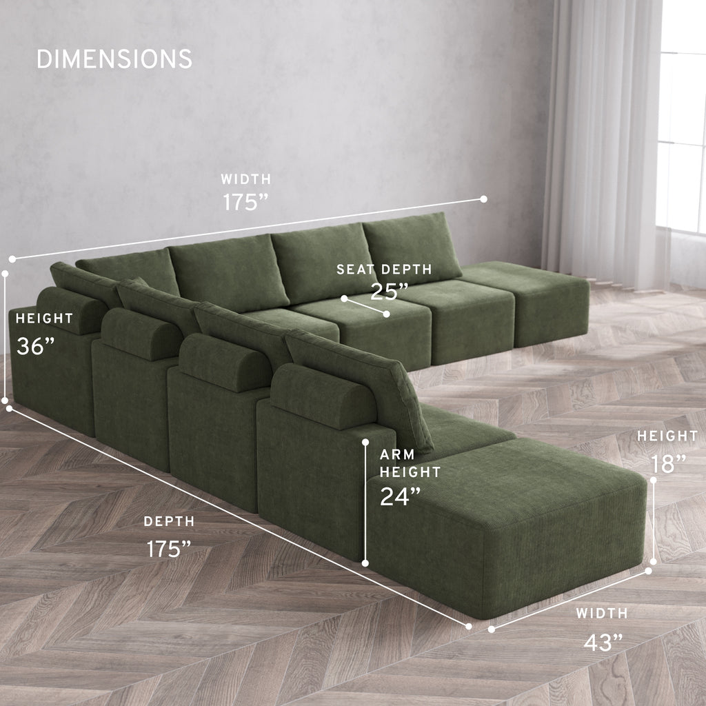 Modular Washable 9-Seater Open-Ends Corner Sectional Cloud + Bolster Sofa | Luxe Corduroy in Juniper