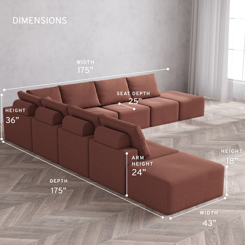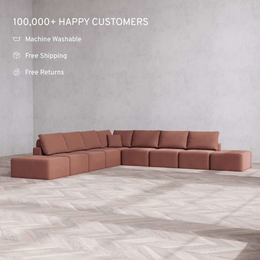 Modular Washable 9-Seater Open-Ends Corner Sectional Cloud + Bolster Sofa | Heirloom Velvet in Sumac