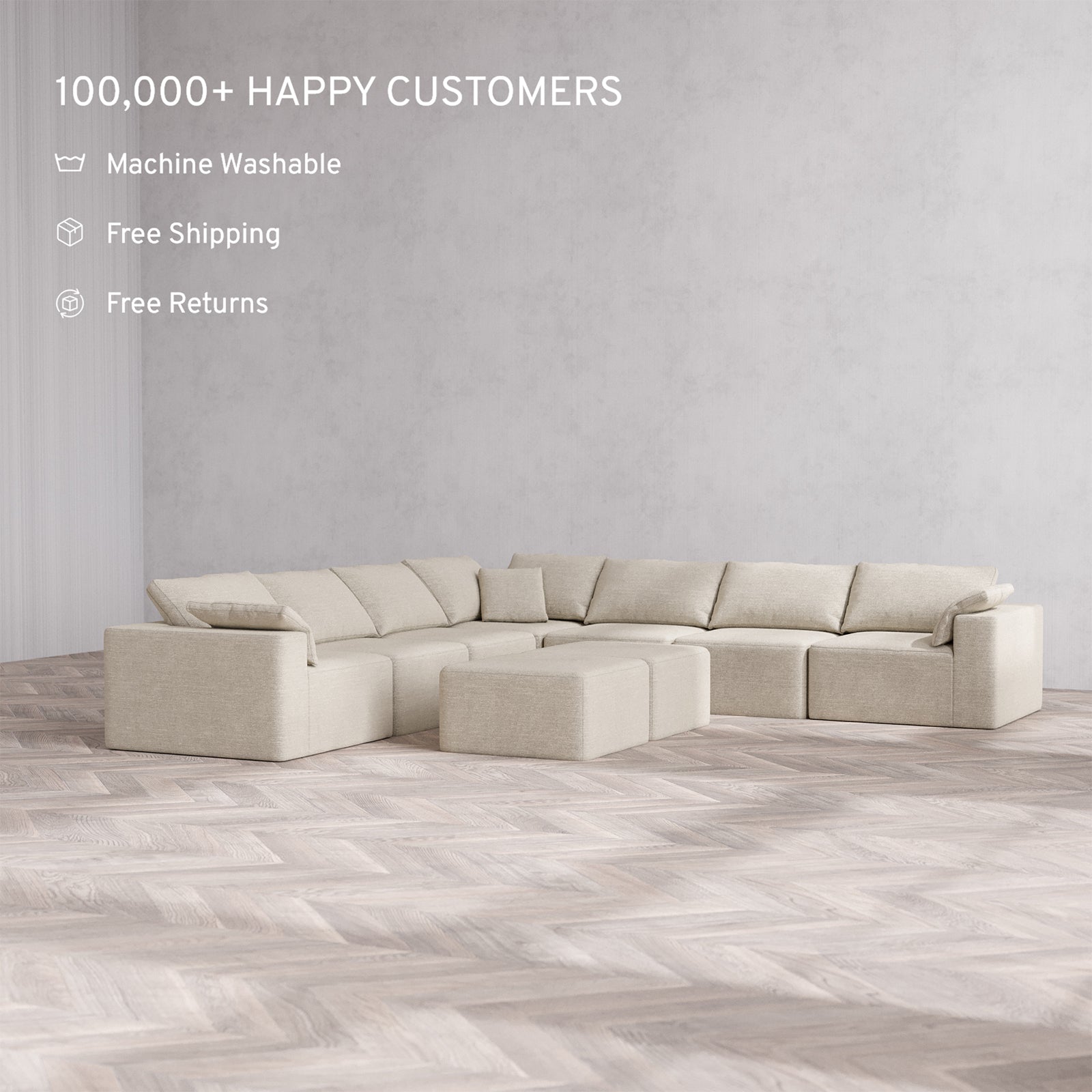 Machine Washable: Every piece of fabric—including the internal quilted duvet—is fully removable and machine washable. It’s the only Cloud-style sofa you can truly deep clean, effortlessly.