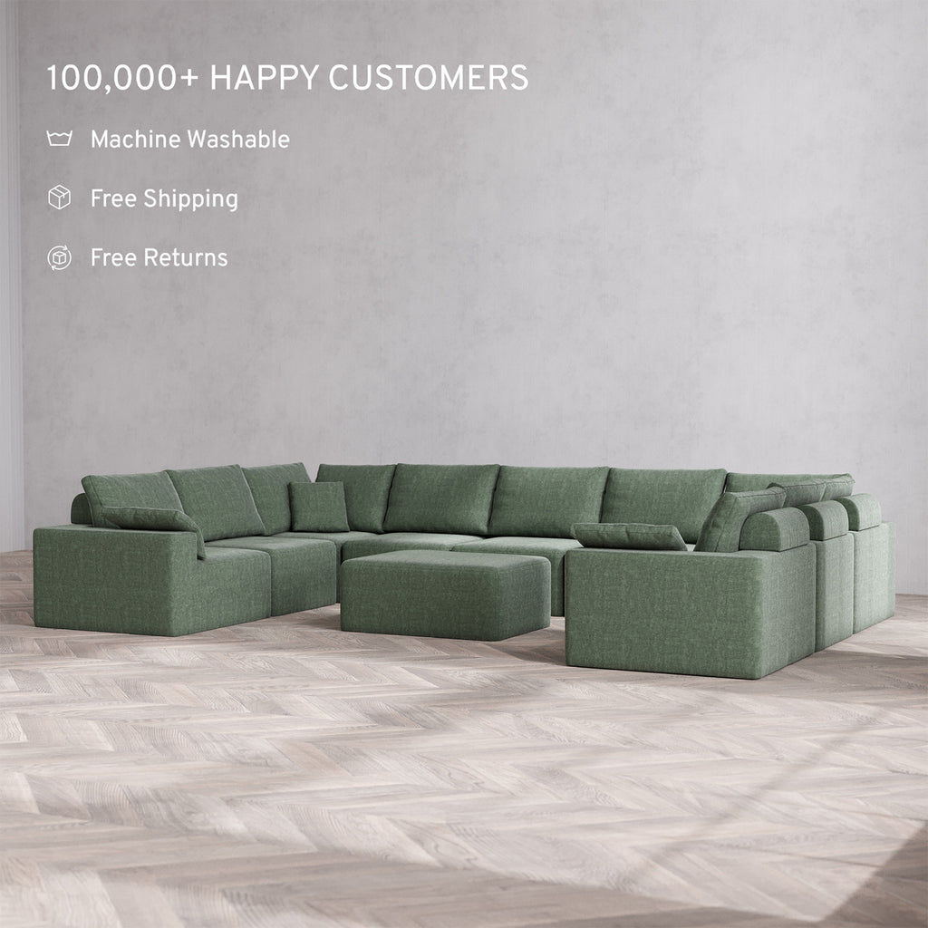 Slipcover Only - Modular Washable 9-Seater U Sectional + Chaise Ottoman Cloud + Bolster Sofa in Sage